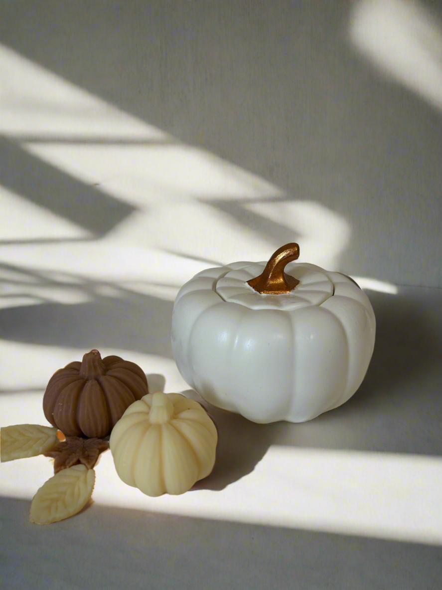 Αρωματικό κερί σόγιας σε χειροποίητη πορσελάνινη κολοκύθα σε λευκό χρώμα .